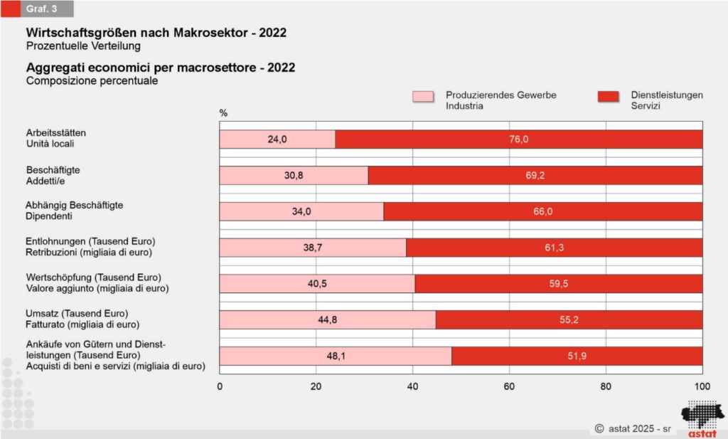 Im Jahr 2022 zählt Südtirol 50.321 Arbeitsstätten im Produzierenden Gewerbe und im Dienstleistungsbereich. Dort arbeiten 207.328 Personen, davon 154.492 als abhängig Beschäftigte.