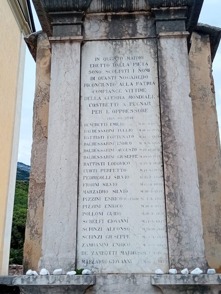 Anche il monumento ai caduti di Nogaredo, realizzato nel 1925, presenta un’epigrafe „di regime“.  Il cippo sorge vicino alla chiesa, appoggiato al lato esterno del muro che ne delimita il piazzale acciottolato, collocato contro un capitello pre-esistente.  A fianco del monumento, un cannone da guerra e un’unica asta da bandiera dove „ovviamente“ sventola il tricolore italiano.