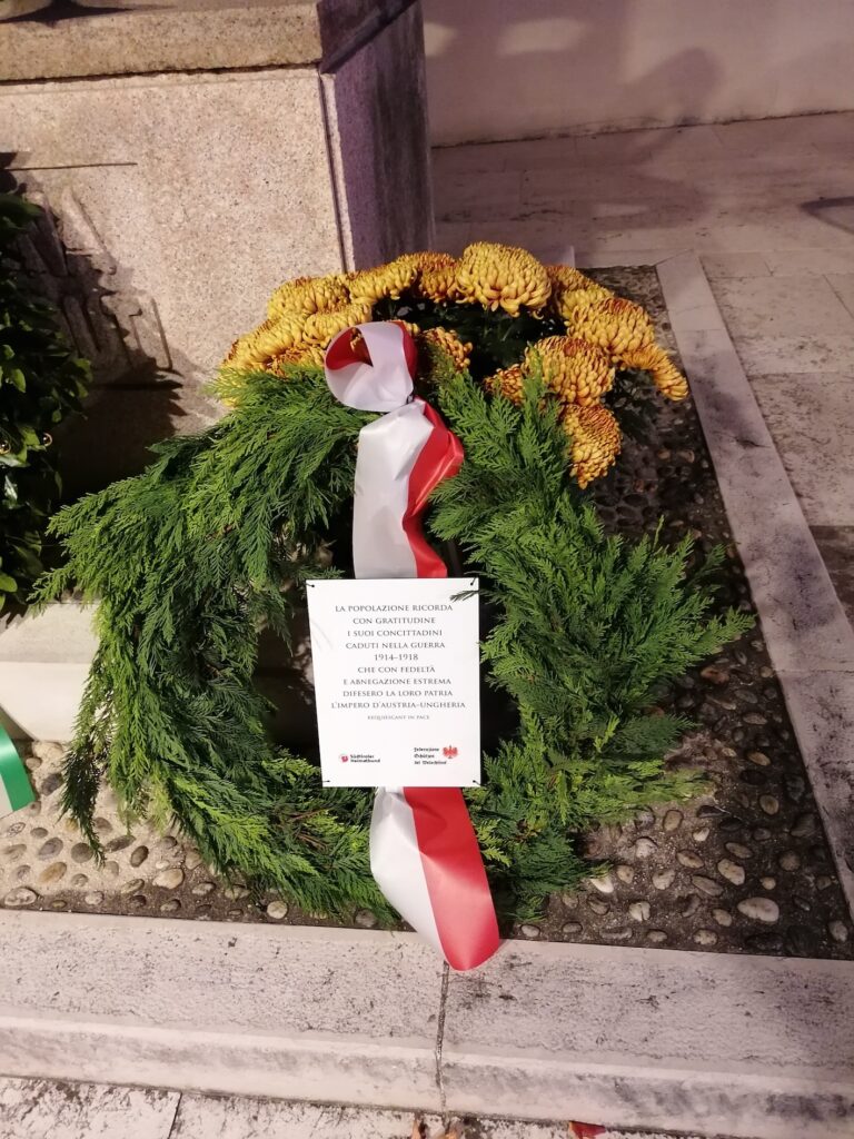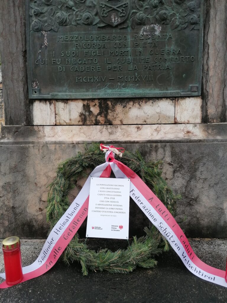 In Civezzano am 19. Oktober und in Kronmetz und San Michele an der Etsch folgte am 4. November eine Kranzniederlegung auf dem jeweiligen Friedhof. Am 31. Oktober 2025 hat eine Delegation des Welschtiroler Schützenbundes und des Südtiroler Heimatbundes einen Tannenkranz am Kriegerdenkmal für die Gefallenen von 1914 bis 1918 auf dem Friedhof Welschmetz-Mezzolombardo niedergelegt. Ettore Facchinelli, Ivo Facchinelli, für den SHB Marcello Delucca, Buchautor Giuseppe Matuella und die Schützenkompanie Kalisberg waren anwesend. Marcello Delucca, Heimatbunddelegierter für Welschtirol, erklärte, dieses Projekt entsteht aus der wichtigen Zusammenarbeit zwischen dem SHB und dem Schützenbund Welschtirol. „Die Gedenktafel, die wir am Kranz anbringen, ist eine von 25 Gedenktafeln. Wir werden sie an den Denkmälern für die Tiroler Gefallenen italienischer Muttersprache des Krieges 1914–1918 anbringen. Erinnerung und historische Wahrheit müssen ans Licht gebracht werden, auch für die jüngeren Generationen. Viele Kriegerdenkmäler tragen faschistische Inschriften, die versuchten, unsere Geschichte auszulöschen. In einigen Fällen sind die Namen von Die Gefallenen sind nicht mehr lesbar, während die Schriften aus der Zeit des Faschismus erneuert wurden. Wir setzen uns für ihre Pflege und Wiederherstellung ein, in Zusammenarbeit mit den Stadtverwaltungen, im Geiste des Friedens und der Wahrheit“, so Delucca