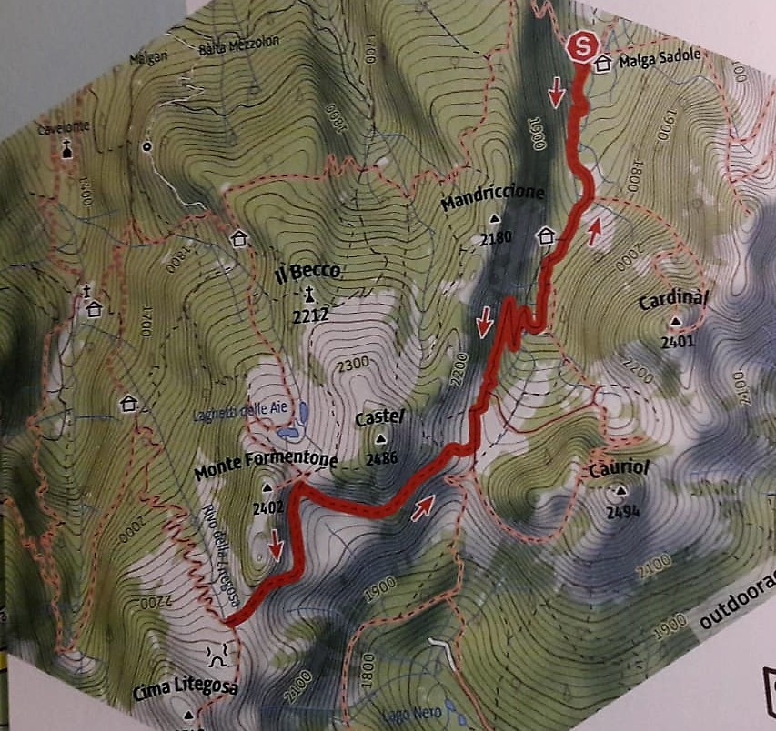 Una variante di percorso è quella che da Malga Sadole (dove si può trovare la fontana costruita e decorata dagli Standschützen Primör, restaurata qualche anno fa dall’attuale compagnia) sale porta all‘omonimo passo. Qui ci sono numerosi baraccamenti e grandi caserme, segno dell’importanza strategica di questo giogo. A fine ‘800 era stato addirittura progettato un forte che avrebbe dovuto rendere più facilmente difendibile il passo, ma i fondi vennero destinati alle più importanti opere dell’altopiano di Asiago. Una grande trincea, appoggiata da postazioni di mitragliatrici e piazzole di artiglieria, sbarrava il valico prima a sud e poi, in seguito alla perdita del Cauriòl, venne apprestata una grande linea difensiva a est; il tutto compreso di ricoveri in caverna e postazioni di mitragliatrice. vi è anche una rete di mulattiere che permettono di muoversi agilmente, il pozzo per la raccolta dell’acqua e le iscrizioni lasciate dai reparti ivi stanziati. Da Passo Sadole, lungo il sentiero 321, si raggiunge Forcella Litegosa.