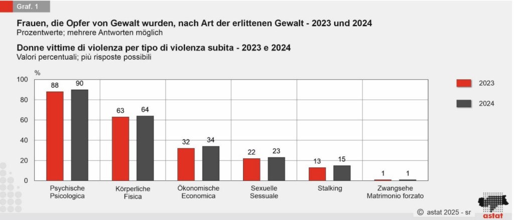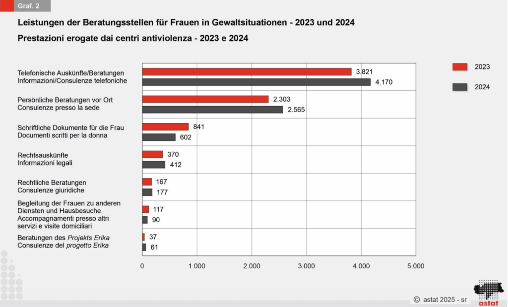 In den vergangenen Jahren wurden in geschützten Einrichtungen überwiegend ausländische Frauen betreut, während in den Beratungsstellen vorwiegend einheimische Frauen Hilfe suchten. 2024 veränderte sich das Bild: 54 Prozent der Frauen in geschützten Einrichtungen und 64 Prozent der Frauen in Beratungsstellen sind italienische Staatsbürgerinnen.