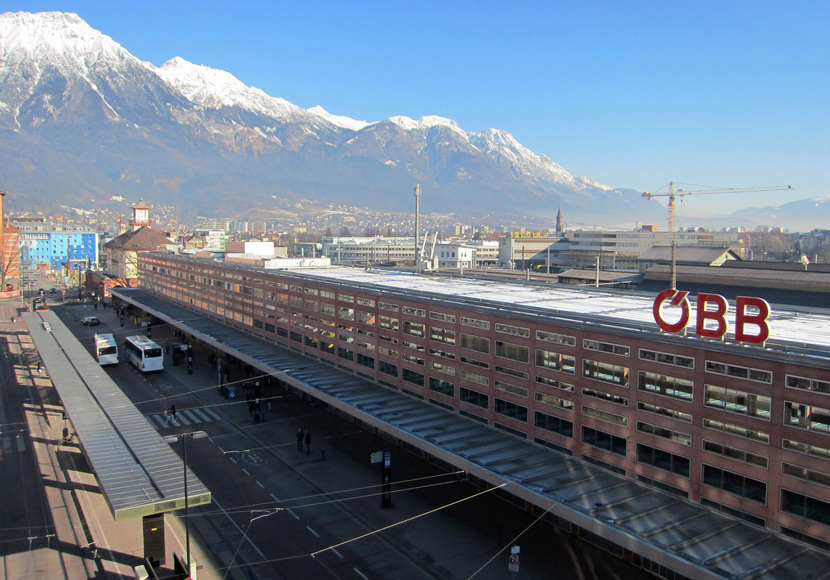 Blick auf den Südtiroler Platz und das Innsbrucker Hauptbahnhofsgebäude von Süden aus, (Quelle: Ray ray ray/Wikipedia)