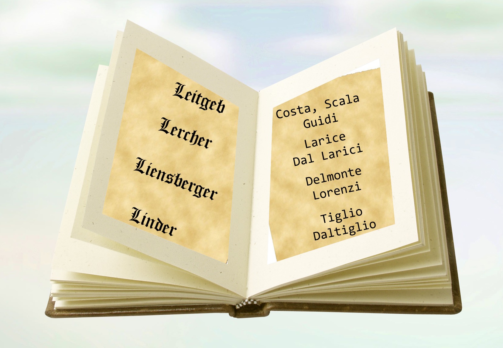 Leitgeb si concentra nelle province di lingua tedesca, soprattutto Südtirol, Tirol, Steiermark… Il nome deriva dal bavarese–austriaco Leit’ (forma dialettale per Leute, “gente, persone”) e da -geb / -geber (“colui che dà/fornisce”). Nella forma originaria Leitgeber, poi spesso abbreviata in Leitgeb, indicava: “colui che dà/serve alla gente” → un oste, locandiere, gestore di una taverna o di un alloggio pubblico e a Tolomei non sfuggì l’etimologia modificandolo in Osti o Tavernari. “Leite” (bavarese e tirolese), indica: un pendio, un costone, un versante ripido, una strada o un passaggio in salita. Leitner significa quindi: “colui che vive sul pendio / sul costone / in salita” oppure “abitante della Leite”. Tolomei si sbizzarrì con Costa, Dallacosta, Scala e Guidi. Lercher proviene da Lärche (tedesco standard) o Lerch / Lerche nelle forme dialettali, che significa: “larice” quindi Lercher significa “colui che vive presso i larici / nella zona dei larici” oppure “abitante del luogo chiamato Larche, Lerch, Lärchwald”. Per Tolomei fu inevitabilmente Larici o Dal Larice e anche Larchi…