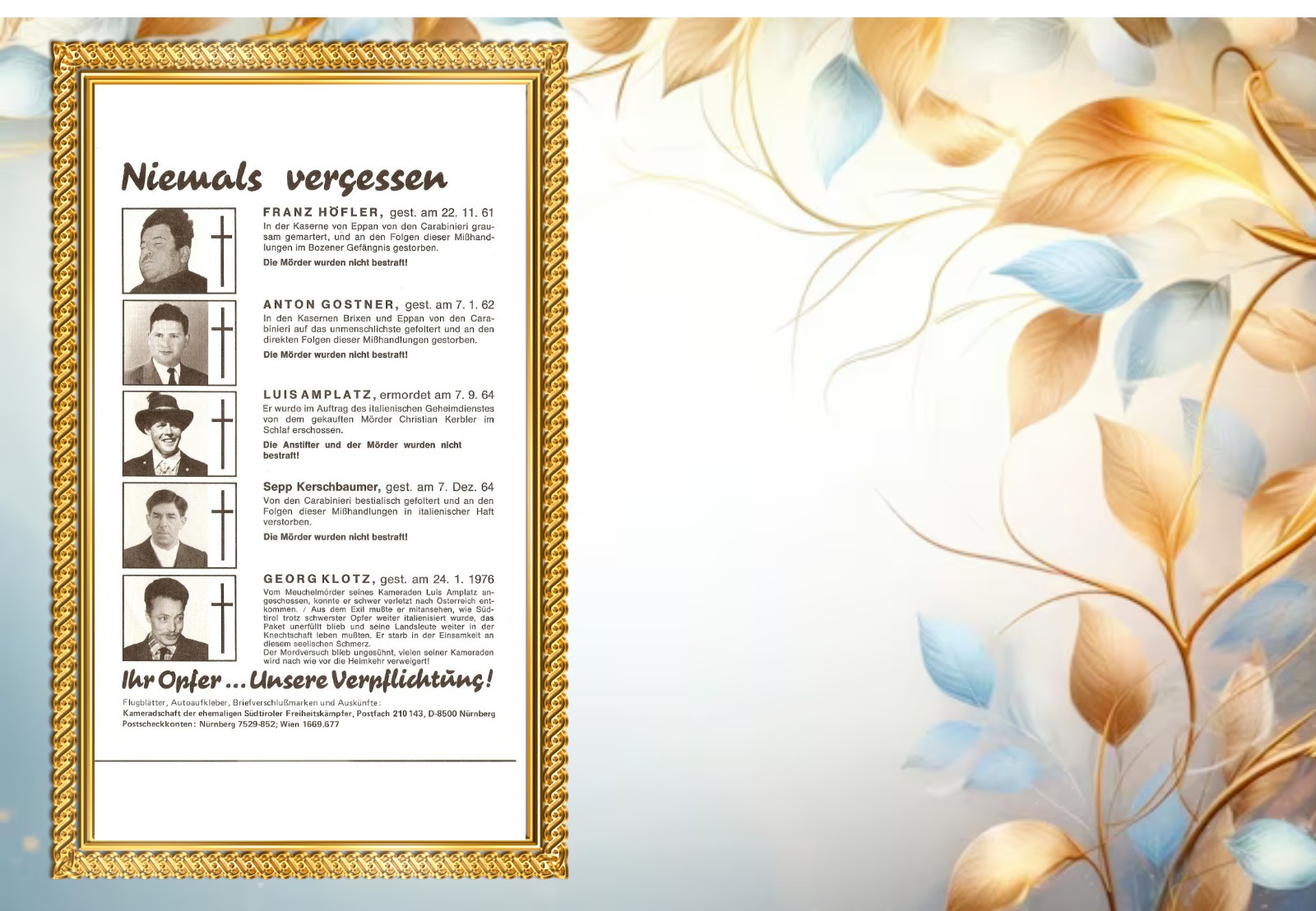 I nomi di alcuni combattenti per la libertà rimasero ignoti, nonostante l’ondata di arresti seguita alla Notte dei Fuochi. Altri riuscirono a sfuggire all’ultimo momento, rifugiandosi per lo più oltre confine, in Austria. Fra questi, il Maggiore degli Schützen Georg Klotz (1919 – 1976), di Walten in Passeiertal, il Sottetenente degli Schützen Luis Amplatz, di Bozen-Gries (1926 – 1964) e i “Pusterer Buibm”, Siegfried Steger, Sepp Forer, Heinrich Oberlechner ed Heinrich Oberleiter.