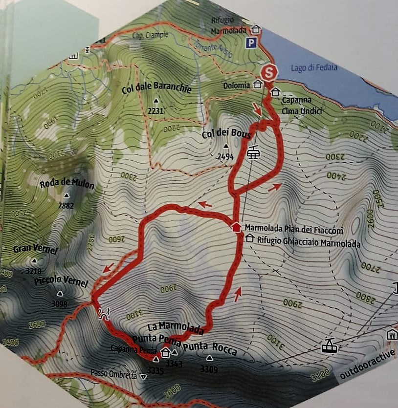 da Pian dei Fiacconi, che si raggiunge da passo Fedaia con gli impianti di risalita o a piedi in 2 ore, salendo a Forcella Marmolada e da qui per la ferrata della cresta nord-ovest ( ore 4 di cammino, difficoltà EEA/D);
