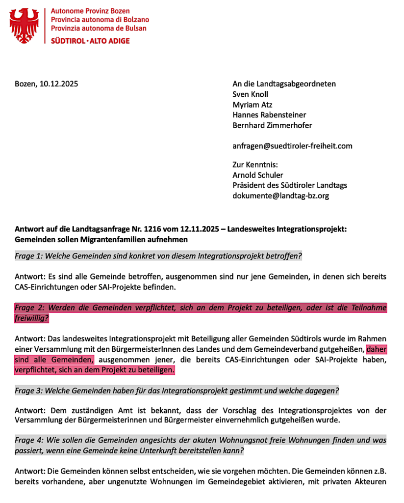 Von Freiwilligkeit ist dort keine Rede, wie aus einem offiziellen Dokument des Südtiroler Landtages ersichtlich ist. Dieses hatte der Landtagsabgeordnete Sven Knoll am Mittwochmittag nochmals an alle Medien verschickt – nachdem LR Pamer zuvor von „Fake News“ bezüglich der angeblichen Gratis-Wohnungen für Migranten gesprochen hatte (UT24 berichtete).