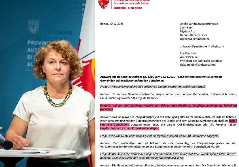 In einer Antwort auf eine Landtagsanfrage der Süd-Tiroler Freiheit hielt die SVP-Landesrätin unlängst fest, dass sich alle Gemeinden – mit wenigen Ausnahmen – am landesweiten Integrationsprojekt beteiligen und eine Flüchtlingsfamilie aufnehmen müssen.