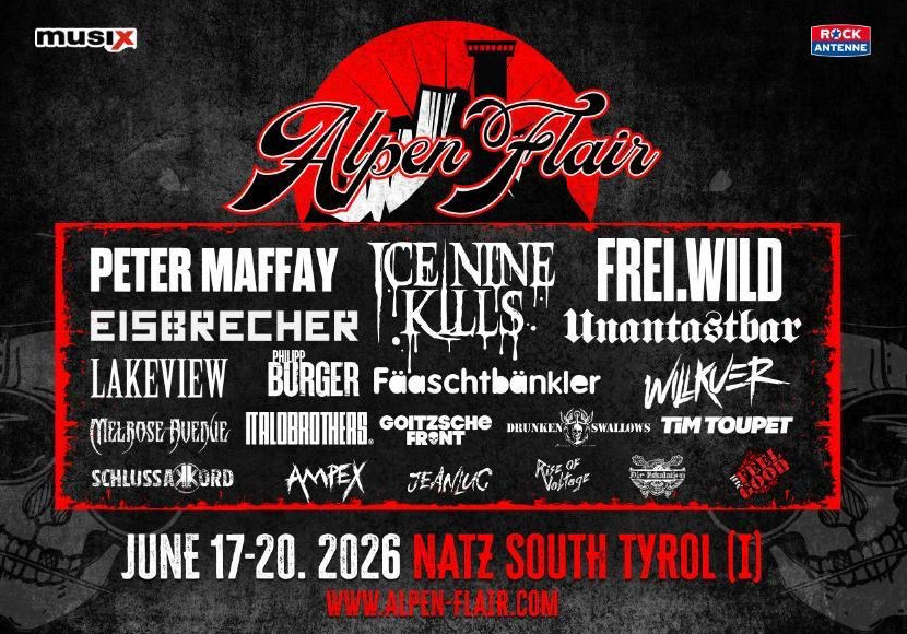 „Das Alpen Flair 2026 wird definitiv sehr groß und das Traumziel ‚Ausverkauft‘ zeichnet sich bei Hochkarätern wie ICE NINE KILLS, Peter Maffay, Eisbrecher, Fäaschtbänkler, die mit weiteren Top-Acts um Festival-Host Frei.Wild in einem dreitägigen Live-Lineup im großen Stil antreten werden, schon ab!“, freut sich Peter Gasser vom Alpen Flair-Komitee in einer Aussendung zum Jahresausklang mit Blick aufs neue Jahr über den Run auf die Tickets 2026.