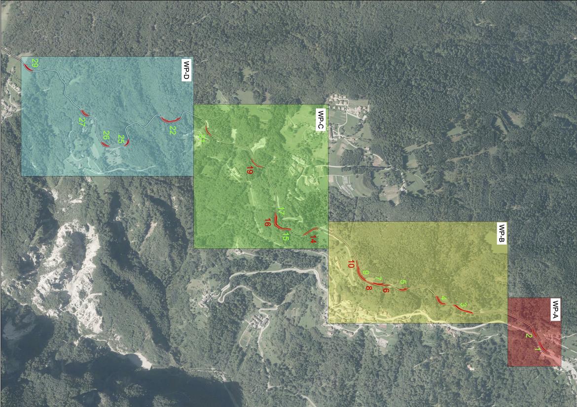 Gli allargamenti a monte saranno realizzati principalmente con scogliere o gabbioni e, in alcuni punti, con la riprofilatura della parete rocciosa. Gli allargamenti a valle, a causa della forte pendenza del terreno, prevedono invece la realizzazione di una piattaforma in cemento armato a sbalzo, sostenuta da micropali, dotata di barriere stradali omologate.