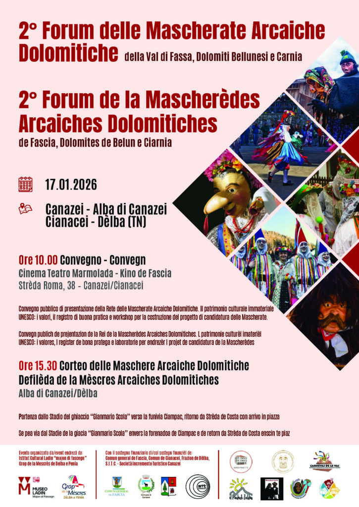 Si terrà sabato 17 gennaio   nel Comune di Canazei il “2° Forum delle Mascherate Arcaiche Dolomitiche”, evento pubblico della Rete delle Mascherate Arcaiche Dolomitiche della Val di Fassa, della Provincia di Belluno e della Carnia, nata su iniziativa del Museo Maschere Dolomitiche di Gianluigi Secco di Borgo Piave (Belluno).
