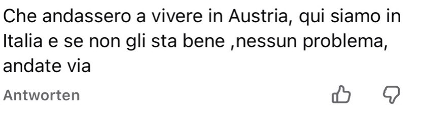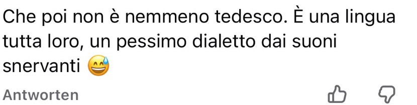 „Che poi non è nemmeno tedesco… un pessimo dialetto dai suoni snervanti“. Hier wird nicht mehr über Inhalte gestritten, sondern über „nervige Laute“. Der Südtiroler Dialekt selbst wird zur Karikatur gemacht, um dessen Sprecher lächerlich zu machen. In Südtirol, wo der Tiroler Dialekt Alltag ist, wirkt diese Abwertung besonders peinlich: Sie zeigt nicht Kenntnis, sondern Angst vor dem, was man nicht kontrollieren kann.