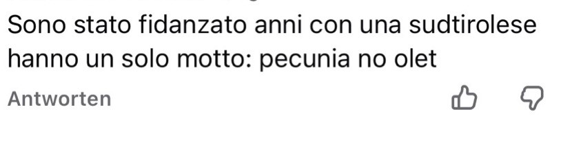 „Sono stato fidanzato anni con una sudtirolese… hanno solo un motto pecunia no olet“. (Anm. der Red.: Der lateinische Spruch „Pecunia non olet“ bedeutet „Geld stinkt nicht“.) So funktioniert Ressentiment: Ein Einzelfall wird zur Diagnose über „die Südtiroler“, und die moralische Abwertung erledigt den Rest. Wer so schreibt, will nicht verstehen – er will beleidigen.