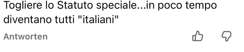 „Togliere lo Statuto speciale… in poco tempo diventano tutti ‘italiani’“. Das ist die administrative Version desselben Nationalismus: Wenn Vielfalt stört, entfernt man die Institutionen, die Vielfalt schützen. Der Kommentar ist so offen, dass er sich selbst entlarvt: Es geht nicht um bessere Integration, sondern um Vereinheitlichung. „Normal“ ist erst, wenn alle gleich sind – oder zumindest so tun.