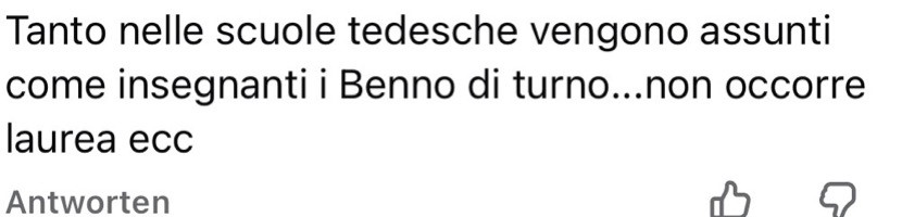 „… vengono assunti come insegnanti i Benno di turno… non occorre laurea ecc“. Auch das ist ein Klassiker: Man diskreditiert Institutionen, ohne etwas Konkretes nachweisen zu müssen. Der Subtext lautet: In Südtirol läuft sowieso alles schief, also braucht man sich mit der tatsächlichen Rechtslage, Zuständigkeit oder Qualifikationsfrage gar nicht erst zu befassen. Diese Aussage zeugt auch von peinlicher Unkenntnis. Denn die deutsche Schule schneidet bei offiziellen Auswertungen signifikant besser ab als ihr italienisches Pedant.