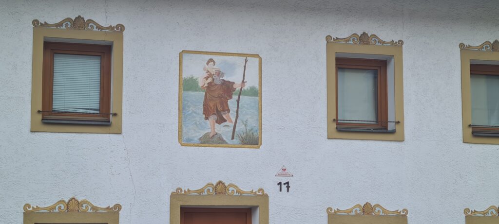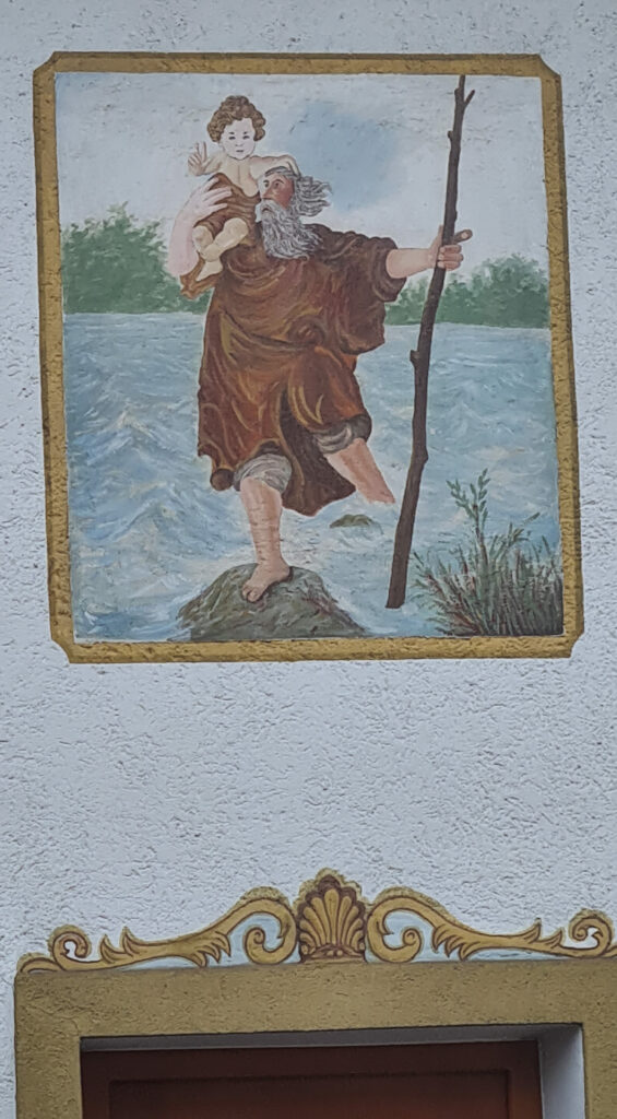 Questo lo abbiamo „scoperto“ durante un soggiorno a Lienz in Osttirol: in questa raffigurazione, che sovrasta l’ingresso di casa tradizionale, bella e curata, il Santo Portatore sembra dover combattere non solo contro la corrente del fiume, ma anche contro un vento fortissimo.