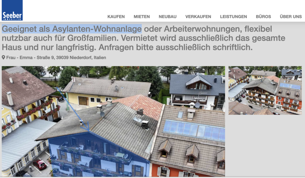 Es stellt sich die Frage: Ist das Inserat das was es vorgibt zu sein oder vielmehr ein taktisches Manöver in einem laufenden Rechtsstreit. Ob und in welcher Form das Projekt tatsächlich realisiert wird, ist weiterhin Gegenstand des Rekursverfahrens. Klar ist jedoch schon jetzt: Die Formulierung „geeignet als Asylanten-Wohnanlage“ hat in Niederdorf eine Debatte ausgelöst, die weit über ein gewöhnliches Immobilienangebot hinausgeht.