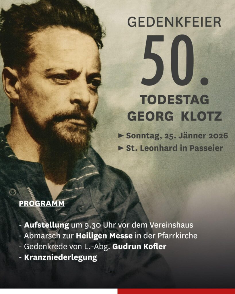 „Padre di famiglia, maggiore degli Schützen, combattente per la libertà , nemico dello stato:  50 anni fa come oggi, nel suo esilio in Nordtirol, moriva mio nonno, Georg (Jörg) Klotz. Solo da morto gli fu permesso di tornare nella sua amata Heimat – – scrive oggi Gudrun Kofler –  Grazie per tutto ciò che hai fatto per la tua Terra e il tuo Popolo. La tua inesauribile volontà di libertà e il tuo coraggio restano per noi esempio e monito all’impegno.„