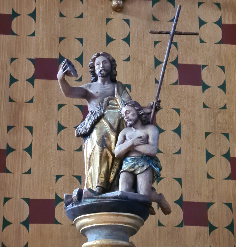 Nella bella chiesa parrocchiale di Sarnthein, fra navata e altari laterali, abbiamo notato questa rappresentazione del Battesimo di Cristo. Secondo i Vangeli, all’età di tren’anni, Gesù si reca al fiume Giordano, dove viene battezzato da Giovanni Battista. Uscendo dall’acqua, vede i cieli aprirsi e lo Spirito scendere su di lui sotto forma di colomba, mentre si ode una voce dal cielo che dice «Tu sei il Figlio mio prediletto».