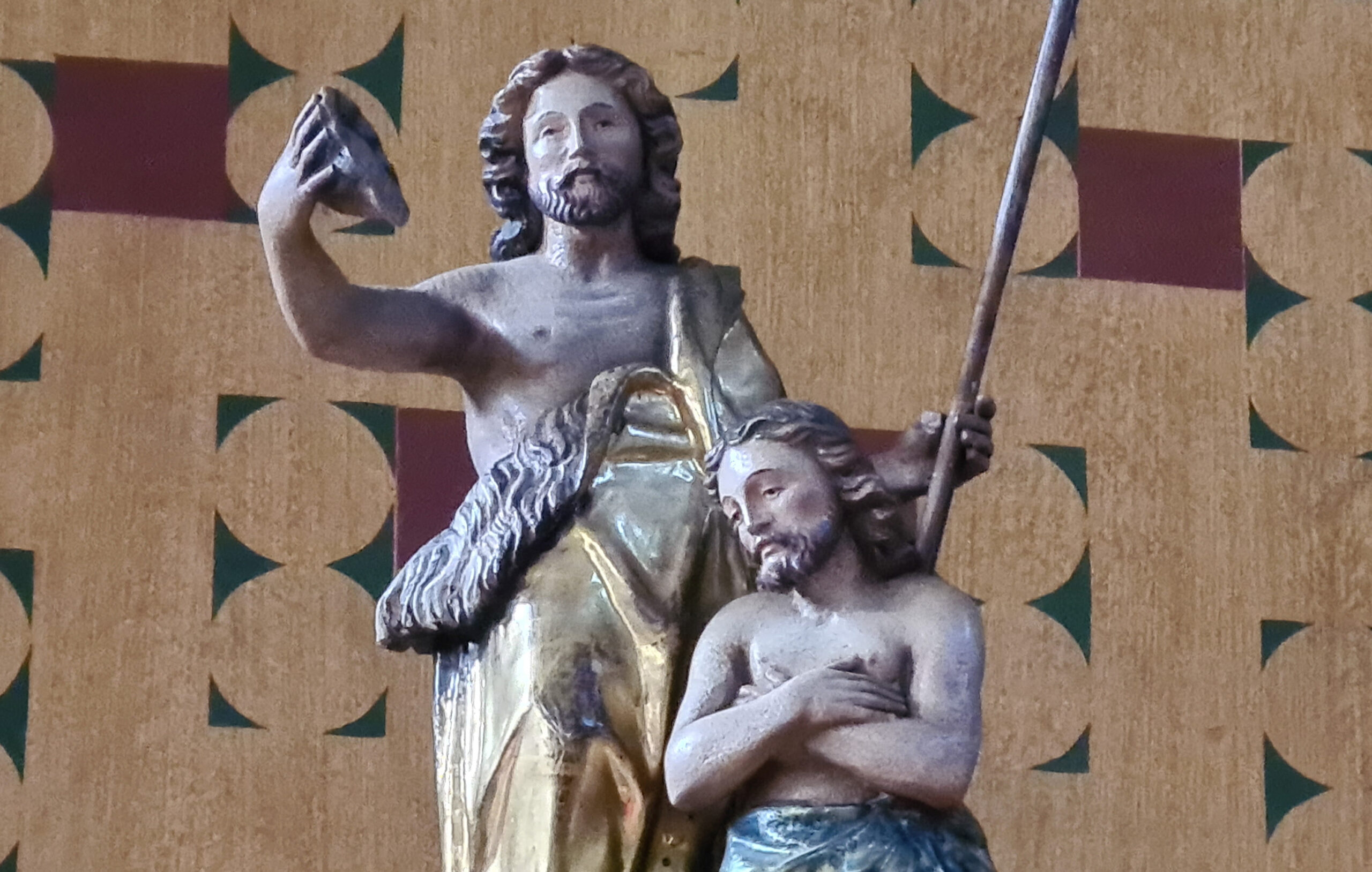 La scultura riesce a raccontare tutto questo: i volti del Battista e di Cristo, cugini di secondo grado, si somigliano: quello di Giovanni sembra più maturo, da uomo che ha compiuto la sua missione; Cristo pare quasi un ragazzo, che però il Battesimo ha reso pronto ad affrontare il cammino della predicazione, del Golgota, del Cielo…