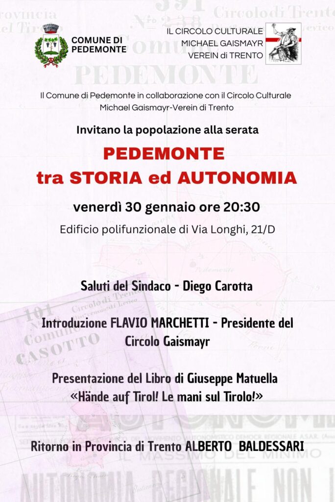 Venerdì 30 gennaio, per l’organizzazione del Comune di Pedemonte in collaborazione con il Circolo Culturale Michael Gaismayr, avrà luogo una serata dal significativo titolo di „Pedemonte tra Storia e Autonomia“