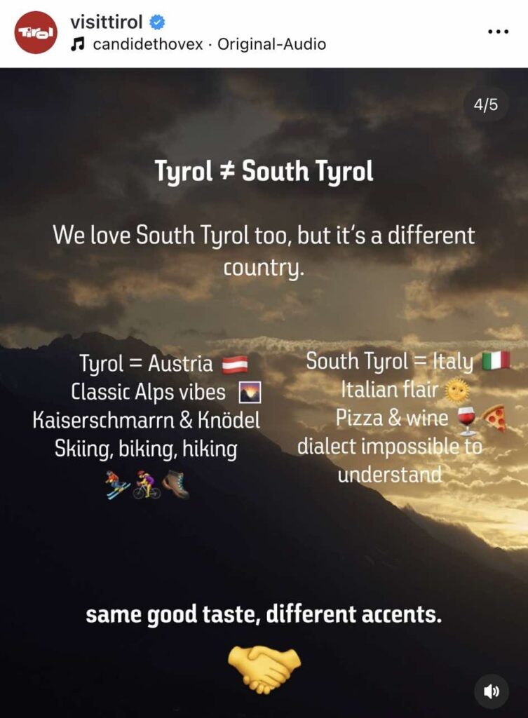 Mit dem Slogan „Tyrol ≠South Tyrol“ wollte die Tirol Werbung auf Instagram an einem europaweiten Trend teilnehmen, bei dem Regionen ihre Besonderheiten humorvoll darstellen. Marketingleiter und Prokurist Patricio Hetfleisch erklärte, man habe mit Augenzwinkern zeigen wollen, was Tirol von anderen Destinationen unterscheidet. In der Umsetzung sei dies jedoch misslungen.