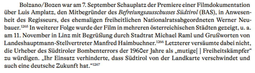 Das DÖW nennt Haimbuchner nicht wegen einer strafbaren Handlung, nicht wegen einer Organisation, nicht wegen irgendeines Delikts. Sondern wegen eines Zitats. Im Bericht heißt es, Haimbuchner habe die Südtiroler Freiheitskämpfer der 1960er Jahre als „mutige[ ] Freiheitskämpfer“ gewürdigt und erklärt: „Ihr Einsatz verhinderte, dass Südtirol von der Landkarte verschwindet und auch eine deutsche Zukunft hat.“