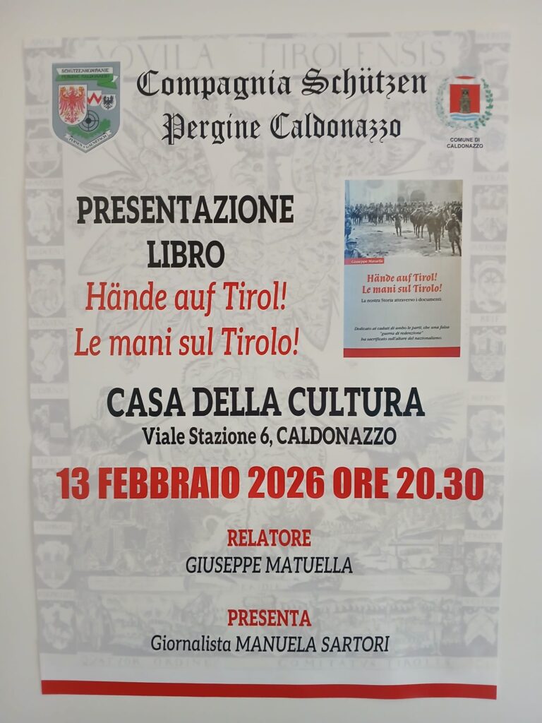 E questa volta, Giuseppe Matuella „gioca“ praticamente in casa: la presentazione di „Hände auf Tirol / Le mani sul Tirolo“ è infatti in programma a Caldonazzo, per l’organizzazione della Compagnia Schützen Pergine Caldonazzo.