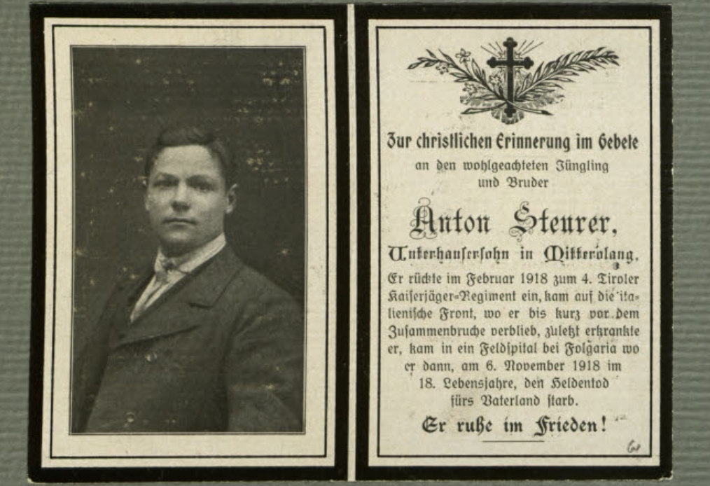 Nell’edizione del Foglio Annunzi Legali pubblicata il giorno 9 luglio 1921, appare l’annuncio (ancora in versione bilingue, sia in italiano che in tedesco, e con la toponomastica originale, mentre i nomi propri sono già italianizzati) dell’avviamento della procedura allo scopo della “dichiarazione di morte di Antonio Steurer, figlio del fu Giuseppe e di Maria nata Brunner … agricoltore, il quale nel 1918 si presentò sotto le armi presso il 4. reggimento cacciatori tirolesi, e sarebbe morto sul fronte italiano nell’ospedale Maria Maddalena presso Folgaria di „grippe“ ai primi di novembre 1918.