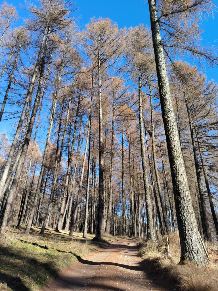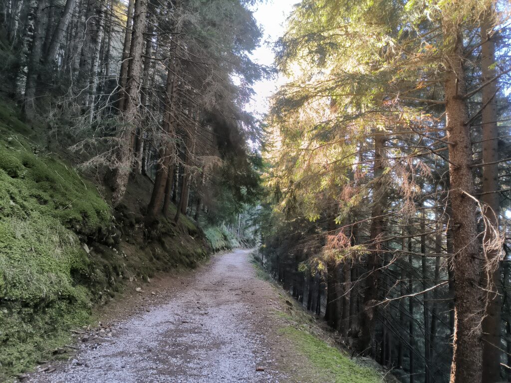 Dal parcheggio a di Daiano si prosegue sulla strada asfaltata raggiungendo località Calvello. Da qui si imbocca la strada sterrata indicata come giro di Solombo che si snoda in mezzo ad un bosco di pini e poi di abeti rossi.