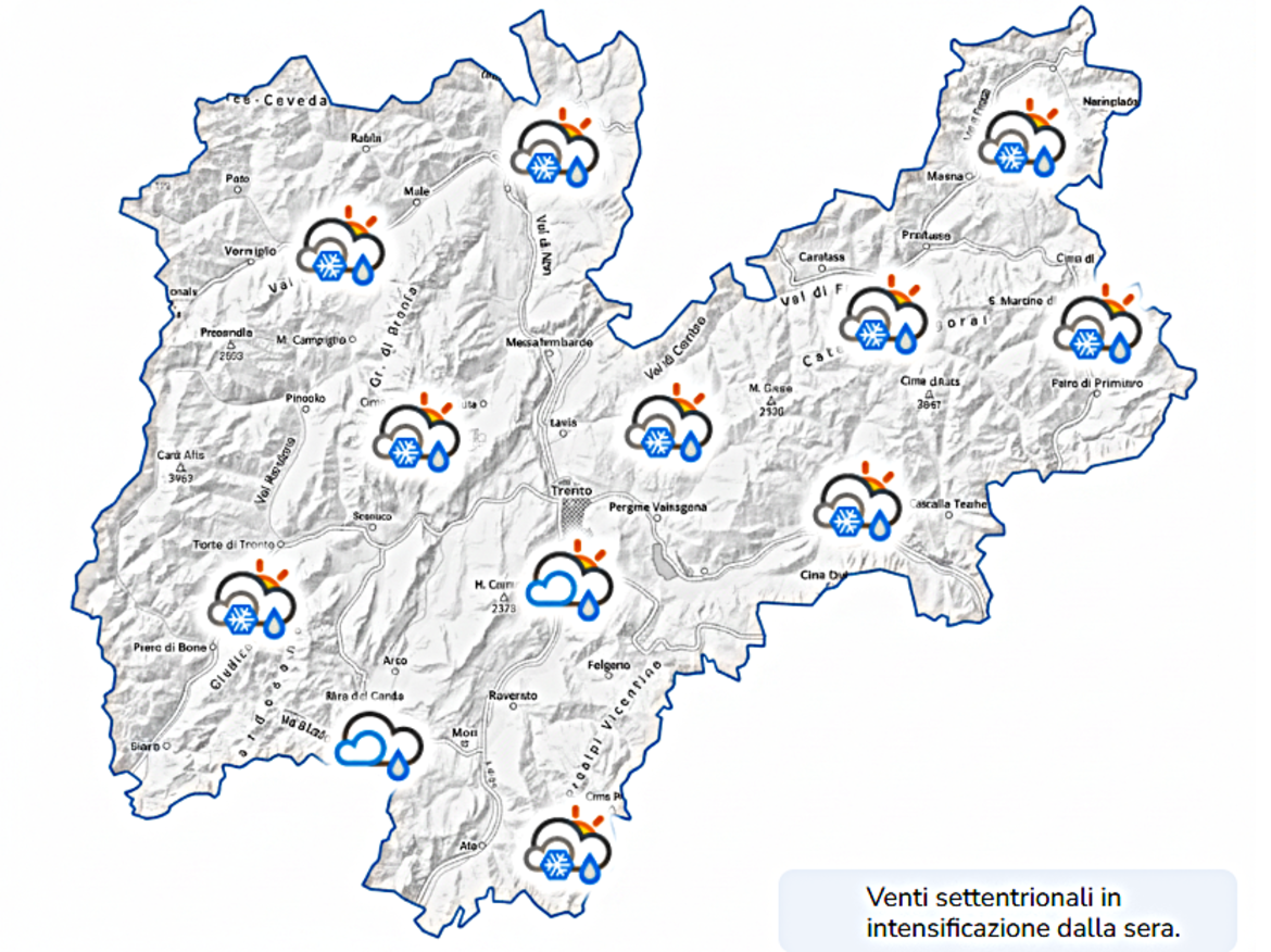 Per la giornata di domani, sabato 14 febbraio, Meteotrentino prevede cielo molto nuvoloso con possibili deboli precipitazioni a tratti, nevose oltre i 1300 metri circa; in montagna potranno cadere alcuni centimetri di neve, ma in valle sarà molto probabilmente solo pioggia.