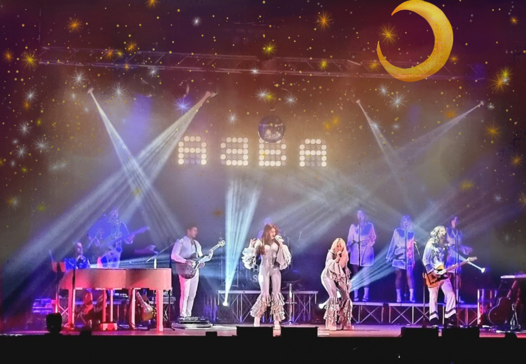 Uno spettacolo messo in scena dagli AdbaShow, pur essendo basato sulle canzoni più famose della band culto degli anni ’70 (eseguite interamente ed esclusivamente dal vivo!) non è solo musica e non è solo Abba, bensì un evento studiato per ricreare l’atmosfera tipica di quegli anni attraverso sonorità , luci, colori, abiti e coreografie. La novità è che ogni canzone è come un capitolo a sé stante dello spettacolo, dove trovano posto a turno coreografie delle cantanti, rappresentazioni quasi teatrali, cambi d’abito (rigorosamente Abba), effetti scenografici e dove possibili pirotecnici. Gli ABBA sono stati molto più di un fenomeno pop: sono un meccanismo perfetto di emozioni immediatamente riconoscibili, una macchina melodica capace di trasformare sentimenti complessi in canzoni limpide, ballabili e memorabili. Dietro la patina scintillante del pop anni Settanta, la loro musica nasconde una profondità sorprendente, fatta di malinconia, disillusione, desiderio e fine dell’amore.
