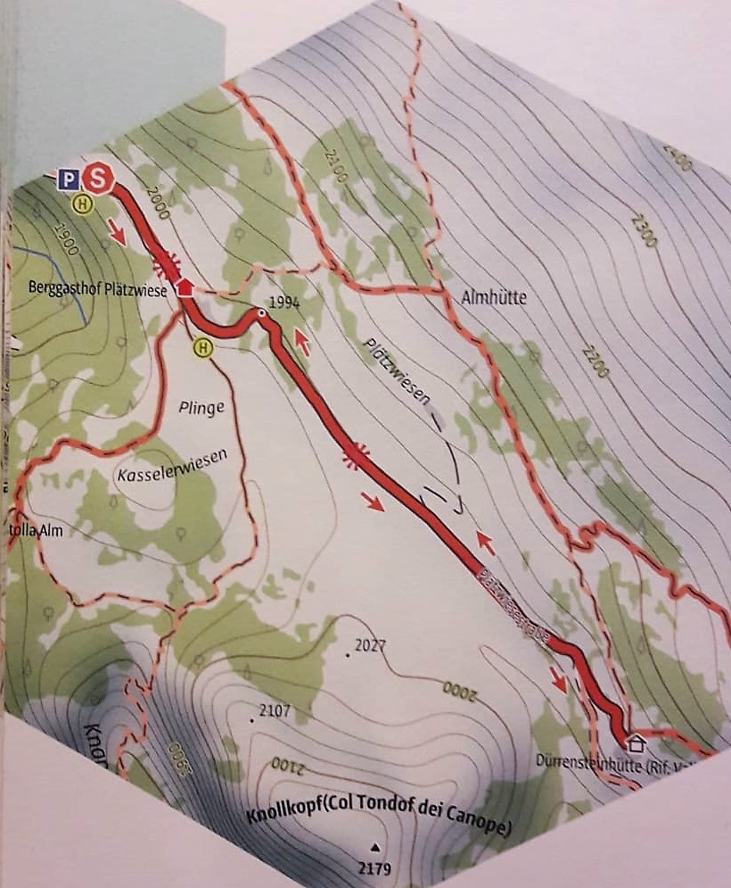 Percorso:  Da Welsberg, nella Pragser Tal fino a Brückele (qui durante i mesi estivi parte la navetta, altrimemti la strada è soggetta a pedaggio), quindi al parcheggio Plätzwiese.   Si segue quindi il sentiero 37 in direzione della Dürrensteinhütte, costruita alla fine degli anni sessanta sui resti di una fortificazione.  La croce di An der Front è nelle immediate adiacenze del forte. Fantastico il panorama fra Cadini, Misurina e Monte Cristallo.