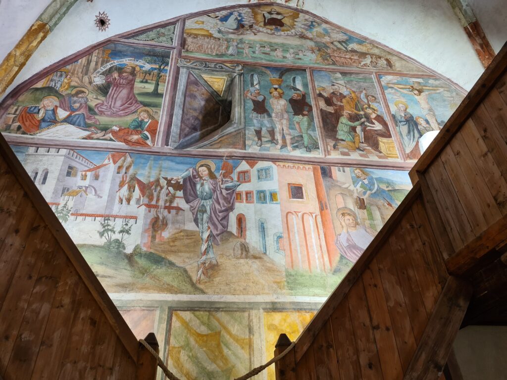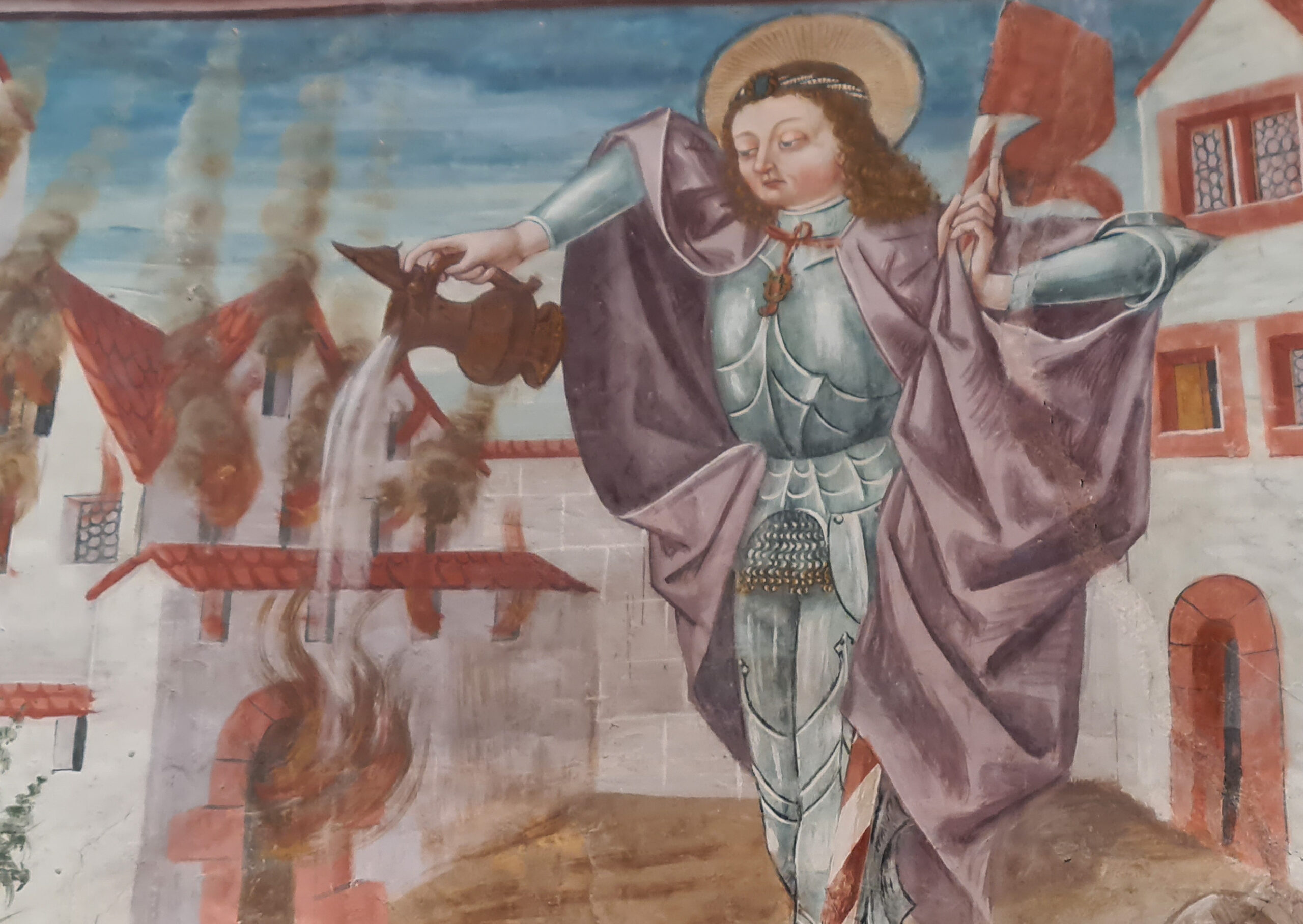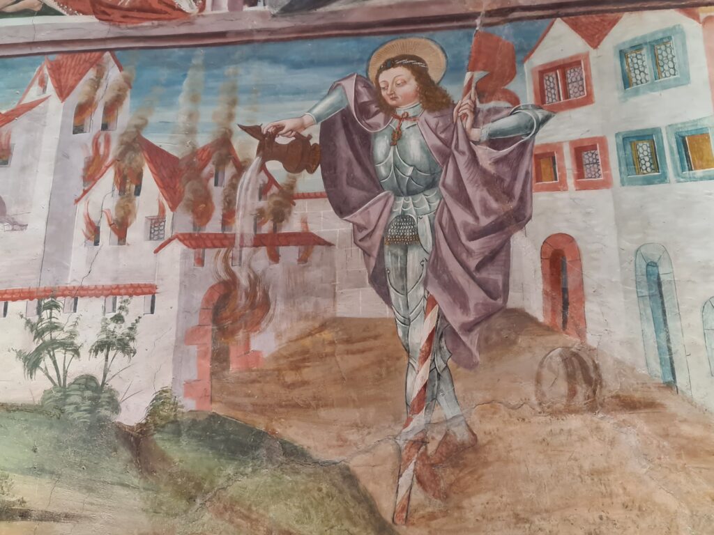 Nella cappella di Schloss Bruck, il castello che sovrasta la città di Lienz, abbiamo incontrato questa raffigurazione di San Floriano. Il Santo protettore dei Vigili del Fuoco indossa l’armatura da cavaliere, nella mano sinistra tiene saldo lo stendardo. Con la mano destra, invece, sta facendo quello per cui viene sovente invocato: con una brocca d’acqua spegne le fiamme che sono divampate in una casa, nel centro cittadino.