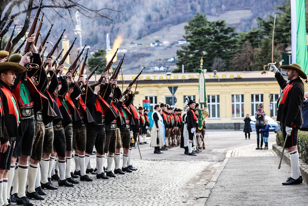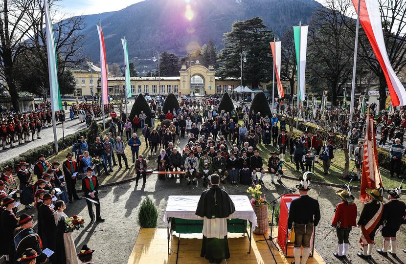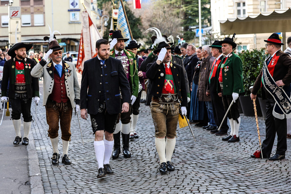 Nach der Aufstellung in der Freiheitsstraße setzte sich der Festzug – begleitet von der Bauernkapelle Völlan – durch die Stadt in Bewegung. Ziel war das Andreas-Hofer-Denkmal im Bahnhofspark, wo die zentrale Gedenkfeier stattfand. Bereits zuvor hatte Landeskommandant Christoph Schmid die Formationen abgeschritten und die Teilnehmer begrüßt.