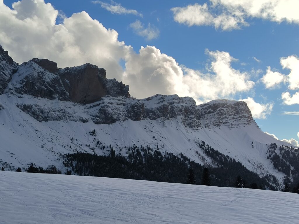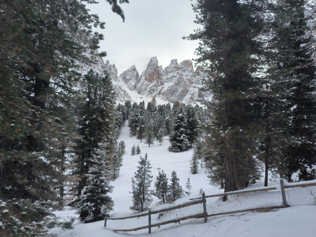 Si parte dal parcheggio a Ranui da dove si segue un’ampia e innevata strada forestale lungo il sentiero 28. Si procede in leggera salita nel bosco fino ad un bivio, si imbocca il sentiero 34 A che procede a tornanti salendo tra gli alberi, oltre i quali si apre sempre di più la vista sulle Geisler