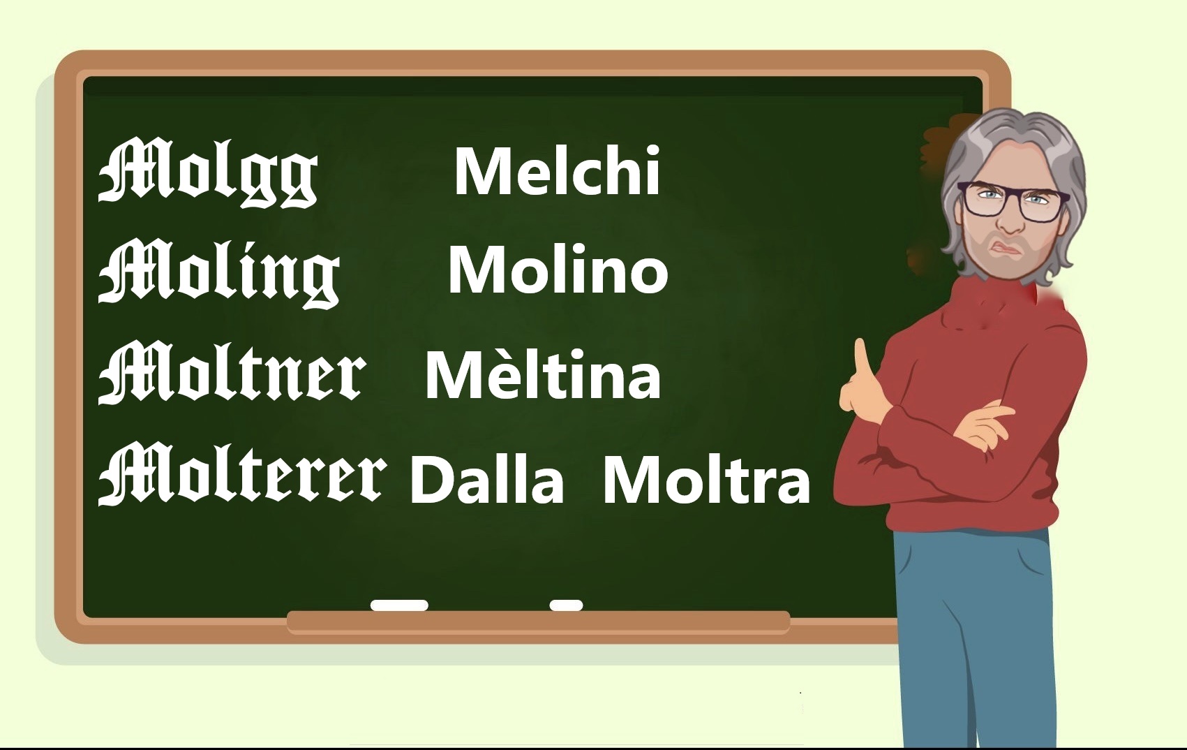 Mòlterer, invece, pur avendo come gli altri cognomi attinenza al mugnaio e al mulino o legato a un soprannome che si riferisce a una caratteristica geografica, come una zona umida o paludosa, in quanto „Molt“ in alcuni dialetti tedeschi può indicare un terreno bagnato o paludoso, Tolomei lo identifico con Dalla Moltra. (continua)