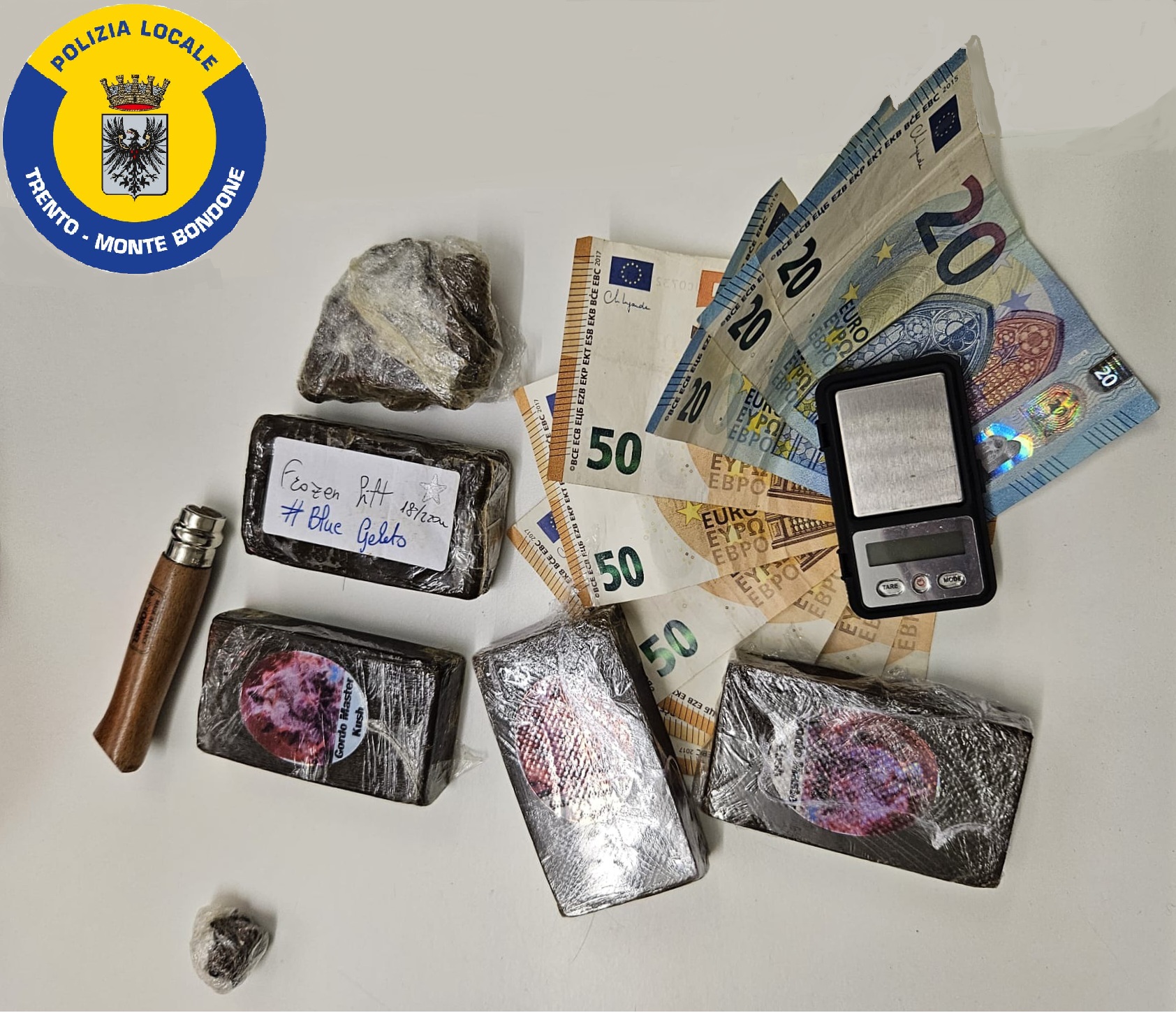 Ha poi consegnato spontaneamente altri tre panetti del peso di un etto l’uno di hashish, un bilancino di precisione e altro materiale da confezionamento che teneva sotto i vestiti. Trento, 6 marzo 2026