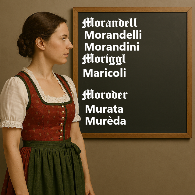 Il cognome Morandel è relativamente raro e ha origini principalmente nell’area alpina tra il Trentino e il Tirolo. L’etimologia non è unica al 100%, si possono indicare alcune spiegazioni molto plausibili. Origine geografica (la più probabile). Il cognome potrebbe derivare da un toponimo o microtoponimo alpino, cioè dal nome di un luogo. È particolarmente diffuso nella zona del Welschtirol, nella Zimmerstal, (Val di Cembra), nel Tirol e in Südtirol. In queste aree molti cognomi nascono da nomi di masi, campi o località. “Morandel” potrebbe quindi significare originariamente “persona proveniente dal luogo chiamato Morandel/Morandèl”. Un’altra ipotesi collega il cognome al nome medievale Morando (o Morand), diffuso nel Nord Italia e nelle zone di lingua germanica. Per non saper né leggere né scrivere l’italianizzatore seriale lo ha semplicemente modificato in Morandelli o Morandini. Anche il cognome Moriggl è piuttosto raro e appartiene chiaramente all’area tirolese e sudtirolese, con radici linguistiche germaniche. Lo si può collegare a un antico nome personale germanico, probabilmente derivato da: Moritz / Morig / Moritzl (varianti regionali del nome Maurizio) oppure da una forma dialettale medievale di Mauritius. Il nome San Maurizio (in latino Mauritius) era molto diffuso nell’Europa alpina medievale per via del culto del santo. L’italianizzazione preferì la versione etimologica da “Maricula” modificandolo in Maricoli, cognome che si aggiunge ai tanti cognomi inesistenti in area italiana.