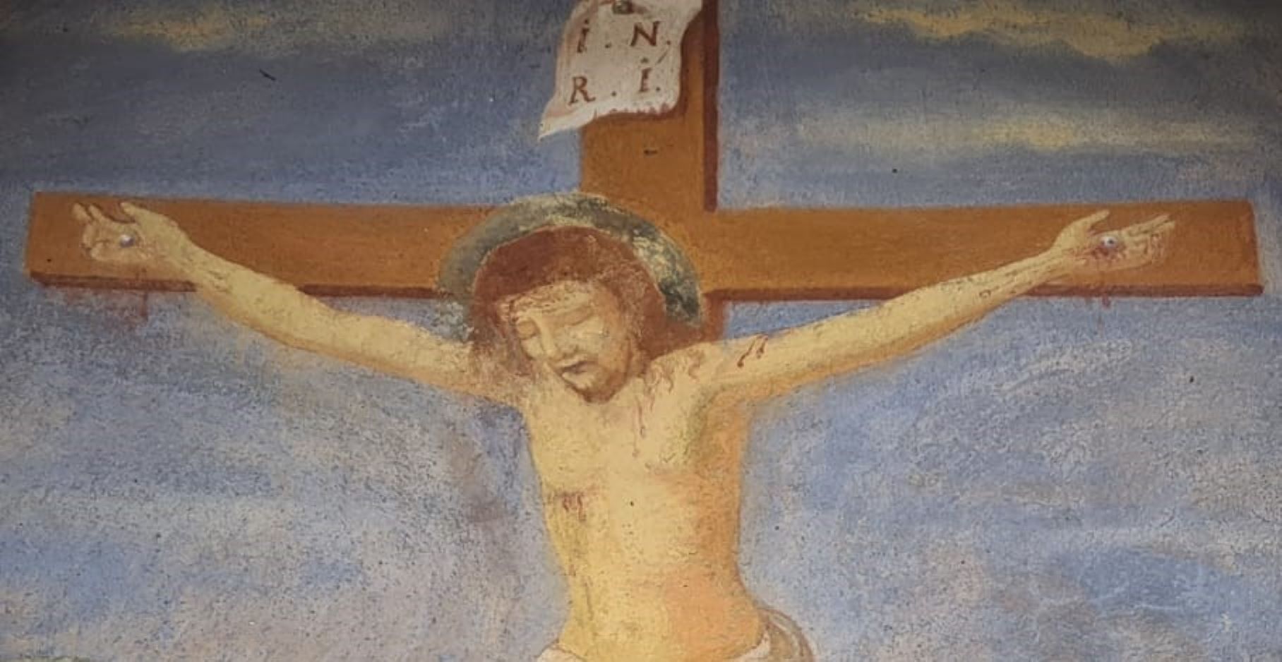 Le ultime due stazioni – le meglio conservate – si trovano sulla facciata della chiesa conventuale, e ne sovrastano l’ingresso. Ecco quella che rappresenta la morte di Nostro Signore.