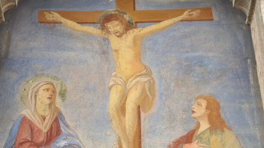 Le ultime due stazioni – le meglio conservate – si trovano sulla facciata della chiesa conventuale, e ne sovrastano l’ingresso. Ecco quella che rappresenta la morte di Nostro Signore.