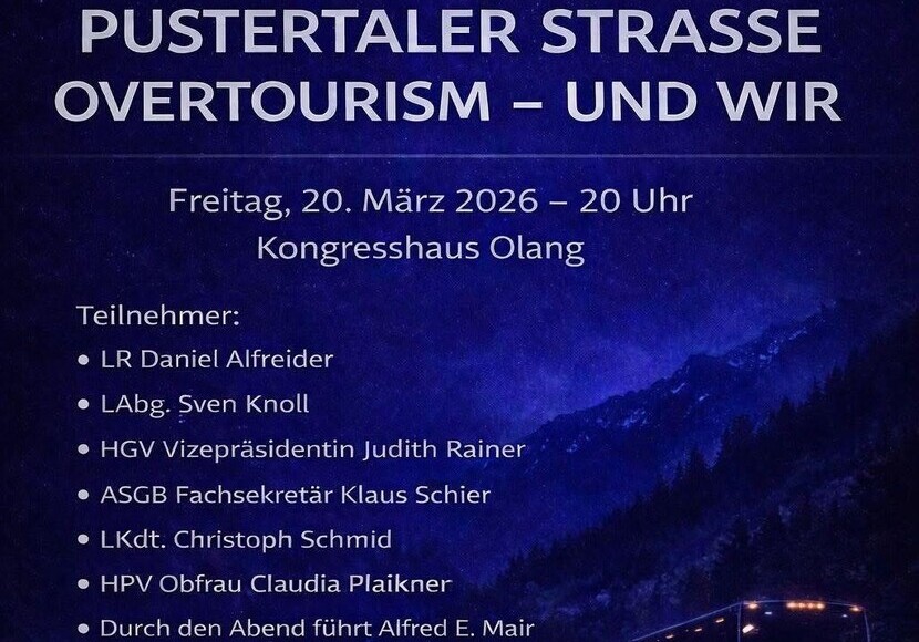 Die Podiumsdiskussion findet am Freitag, 20. März, im Kongresshaus von Olang statt und beginnt um 20.00 Uhr. Wer sich ein Bild davon machen will, wie ernst die Lage im Pustertal inzwischen geworden ist, und wer hören will, welche Antworten Politik, Wirtschaft und Interessenvertreter auf diese Entwicklung geben, wird an diesem Abend Gelegenheit dazu haben.