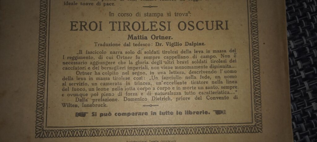 “Se l’Austria dovesse soccombere, allora preferisco essere sepolto in Serbia piuttosto che tornare in Sudtirolo!” Più di una volta si espresse così, e aggiungeva: “Dobbiamo vincere! L’Italia vuole il Tirolo fino al Brennero! Dobbiamo salvare il Tirolo!”