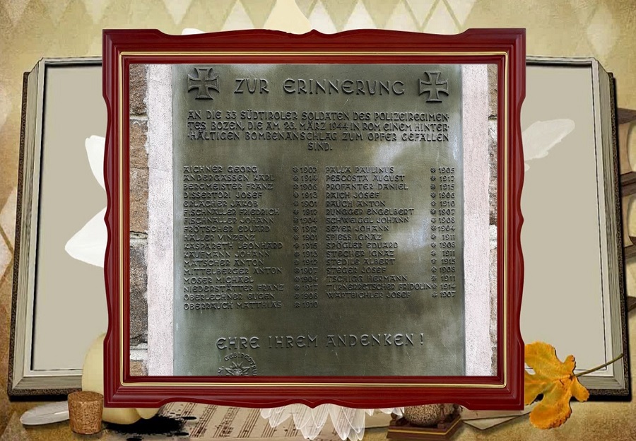 E per non dimenticare i 33 soldati tirolesi vittime della violenza partigiana: Andergassen Karl n. 5/1/1914; Bergmeister Franz n. 6/9/1906; Dissertori Josef n. 5/6/1913; Eichner Georg n. 21/4/1902; Erlacher Jakob n. 12/7/1901; Fischnaller Friedrich n. 19/11/1902; Fischnaller Johann n. 17/11/1904; Frotscher Eduard n. 19/12/1912; Kaspareth Leonhard n. 28/1/1915; Kaufmann Johann n. 19/10/1913; Matscher Anton n. 12/6/1912; Mittelberger Anton n. 15/11/1907; Moser Michael n. 29/9/1904; Niederstatter Franz n. 1/6/1917; Oberlechner Eugen n. 30/4/1908; Oberrauch Mathias n. 15/8/1910; Palla Paulinus n. 31/12/1905; Pescosta Augustin n. 9/5/1912; Profanter Daniel n. 22/5/1915; Raich Josef n. 14/12/1906; Rauch Anton n. 5/8/1910; Rungger Engelbert n. 21/12/1907; Schweigl Johann n. 13/8/1908; Seyer Johann n. 3/6/1904; Spiess Ignatz n. 4/7/1911; Spogler Eduard n. 11/7/1908; Stecher Ignatz n. 11/5/1911; Stedile Albert n. 26/6/1915; Steger Josef n. 10/8/1908; Tschigg Hermann n. 23/4/1911; Turneretscher Fidelius n. 19/1/1914; Wartbichter Josef n. 13/11/1907; Vinzenz Haller (è il 33° soldato del Bozen morto nella notte susseguente l’attentato per le ferite riportate ).