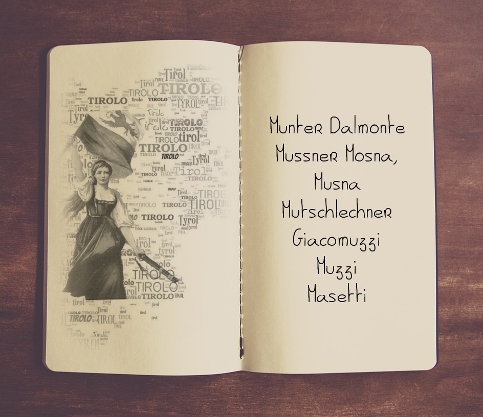 Il cognome Munter ha origini principalmente germaniche e può avere più interpretazioni a seconda dell’area geografica e del contesto storico. Deriva dalla parola tedesca “munter”, che significa: “allegro”, “vivace”, “di buon umore”. In questo senso, il cognome nasce probabilmente come soprannome attribuito a una persona dal carattere energico o gioioso. Può anche essere una variante di cognomi come Münter (con umlaut), dove la pronuncia cambia leggermente. In alcuni casi potrebbe avere legami con nomi propri medievali germanici derivati da radici come mund (protezione) o mun. Significato simbolico: chi portava questo cognome veniva probabilmente identificato come una persona solare e dinamica, qualcuno pieno di energia o spirito positivo. Questo di sicuro Tolomei lo ignorava inclinando la sua patologia verso il nome della località Munt-mons, inventandosi così Dalmonte… Anche Mussner ha un’origine alpina e germanica, ed è particolarmente legato all’area del Tirolo storico. Potrebbe indicare una persona proveniente da un luogo chiamato Muss o simile (un maso, un terreno o una località alpina). La radice “Muss” in tedesco può significare: “poltiglia” o “miscela” (in senso culinario, come una purea) oppure derivare da antiche parole legate a terreni umidi o fangosi. In questo caso, Mussner indicherebbe qualcuno che viveva in una zona paludosa o fertile oppure lavorava la terra (contadino). Ebbene per Tolomei fu un pratico Mosna o Musna…