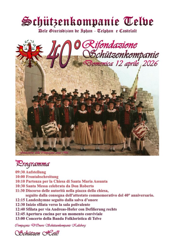 Il programma prevede il ritrovo a Telve e la Aufstellung dalle ore 09.30, quindi alle 10.00 la Frontabschreitung e la sfilata fino alla chiesa di Santa Maria Assunta dove, alle 10.30, don Roberto celebrerà la Santa Messa. Al termine della funzione religiosa, nella piazza della chiesa ci saranno gli indirizzi di saluto ed i discorsi delle autorità presenti, seguiti dalla consegna degli attestati commemorativi del 40° anniversario agli Schützen fondatori ancora in vita. Il Landeshymne e la Salva d’onore chiuderanno la parte ufficiale della giornata.
