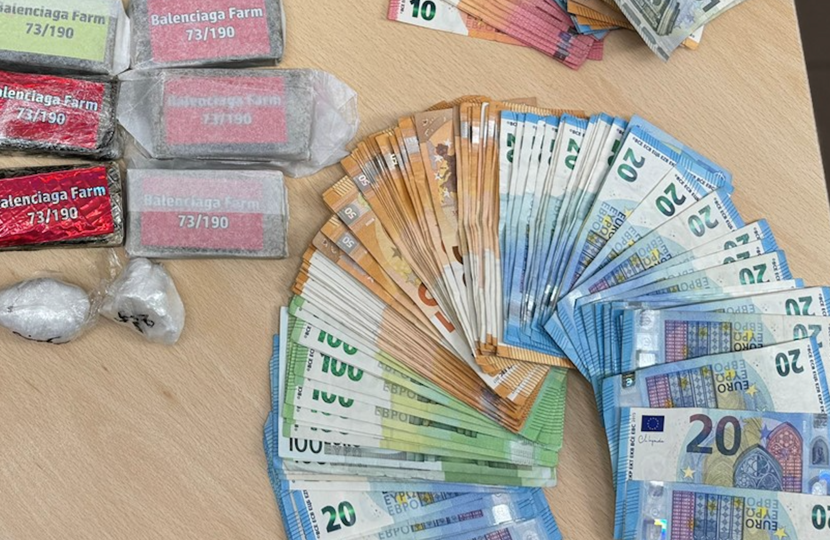 Bei der anschließenden Durchsuchung des Fahrzeugs und der Personen fanden die Beamten eine größere Menge Drogen: rund ein Kilogramm Haschisch, aufgeteilt in zehn Stücke, sowie 52 Gramm Kokain. Außerdem wurden 600 Euro Bargeld sichergestellt.
