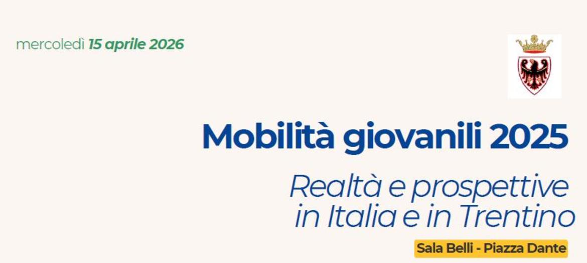 „Mobilità giovanili 2025. Realtà e prospettive in Italia e in Trentino“: questo è il tema dell’appuntamento che si terrà mercoledì 15 aprile, dalle ore 9.00, in Sala Belli nella sede della Provincia autonoma di Trento, in Piazza Dante.