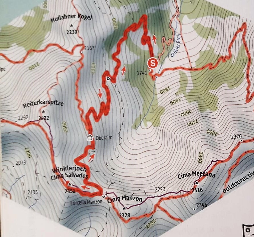 Percorso: Fra Untertilliach e Obertilliach si prende la strada forestale che si inoltra nella Winklertal, fino a raggiungere la testata della valle. Qui si segue la carrareccia marcata 403 che sale in ampie serpentine fino alla malga Oberalm. La strada è abbastanza agevole ma sale decisa per circa 600 metri di quota. Dalla malga, si sale ancora per un centinaio di metri per raggiungere il Winklerjoch / forcella Manzon, dove si incrocia l’Alta Via Carnica. Seguendo la traccia di quest’utlima in direzione ovest e salendo per altri 100 metri di quota, si può arrivare a Cima Salvades / Quote 2351. Il rientro avviene per lo stesso percorso dell’andata.