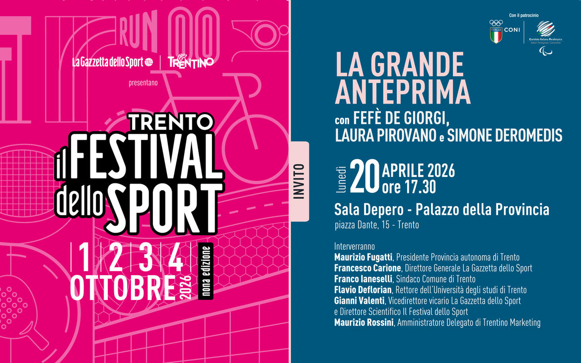 Si svolgerà in Sala Depero, nel palazzo della Provincia, l’inedita Grande Anteprima della nona edizione de Il Festival dello Sport di Trento. L’evento, in programma lunedì 20 aprile alle 17.30, sarà l’occasione per vivere in anteprima le emozioni della prossima edizione in calendario dal 1° al 4 ottobre 2026.