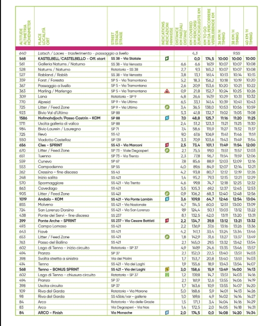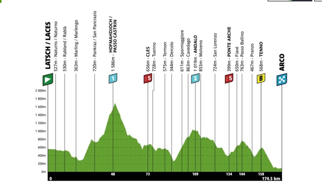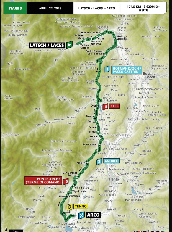 Scatta dal fondovalle della Venosta la terza frazione del Tour of the Alps 2026, 175,1 chilometri da Latsch ad Arco. Dopo 26 chilometri di pianura, a Lana il profilo altimetrico cambia radicalmente con la lunga ascesa di prima categoria verso il Passo Castrin (22,2 km al 5,7%), il punto più alto di questa edizione, a quota 1.586 metri.